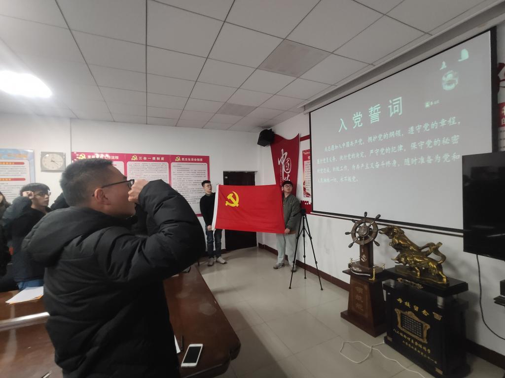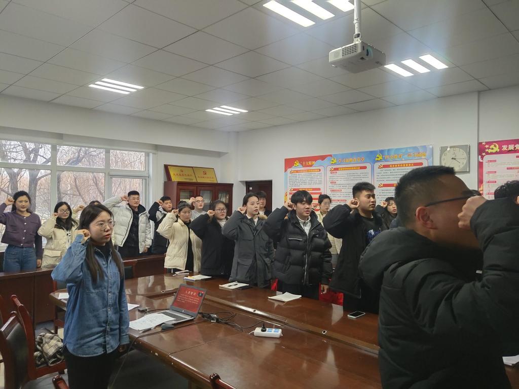 卫建勋代表学院党委对按期转正的9位同志表示祝贺,并对他们表现予以肯要,号召大家时刻保持对党的事业的热爱和追求,勉励同学们坚定理想信念,勇担时代使命,不断砥砺前行。最后,进行宣誓环节,支委会成员明强带领在场全体党员面对党旗进行了庄严的宣誓。