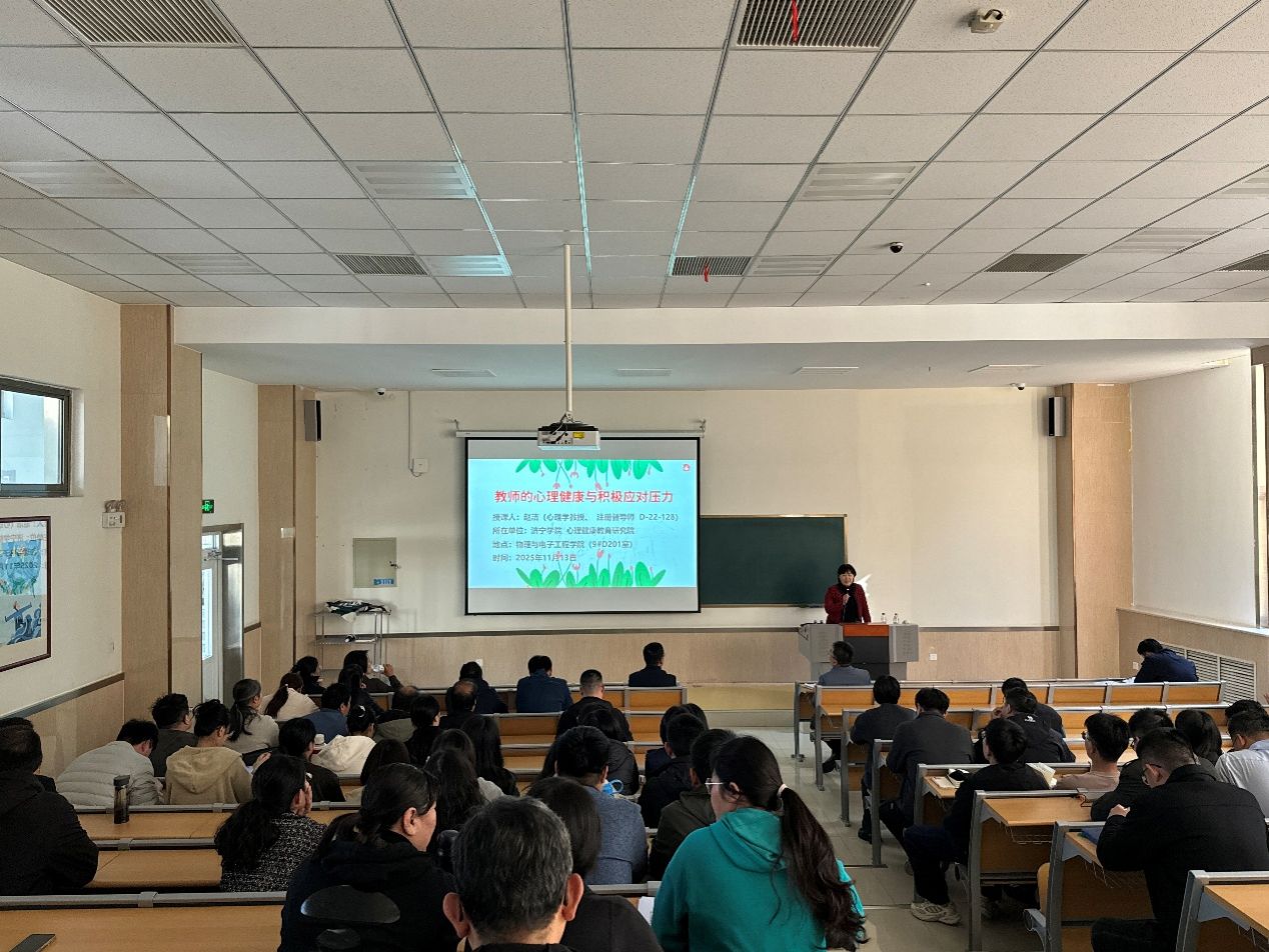 会议伊始,学院特邀我校教师教育学院赵洁教授为全体教师做了《教师的心理健康与积极应对压力》的报告,赵洁教授从生理和心理两方面介绍了缓解压力、调节身心的理论、方法与实践,并现场示范了多个有效的动作妙招,受到老师们的欢迎。