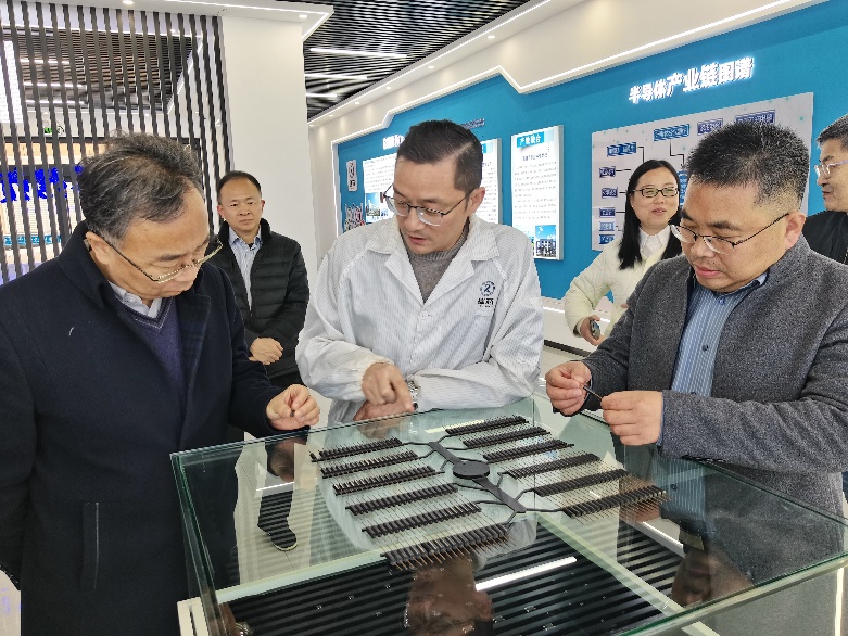 随后,学院一行4人继续赴济宁瑞芯半导体有限公司进行调研交流。瑞芯半导体董事长施立秋对卫建勋书记、岳现房院长一行表示了热烈欢迎并进行了企业参观。我院一行深入瑞芯半导体芯片研发生产基地一线,零距离观了半导体芯片和整流元器件的全流程生产线,包含了划片机、激光切割机、分选机和性能测试仪等先进生产研发设备。