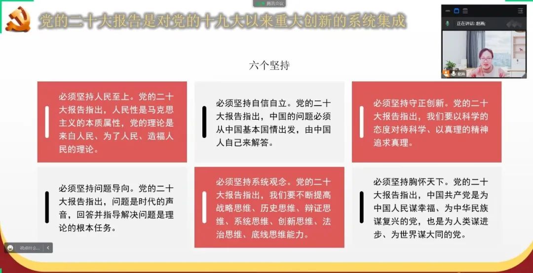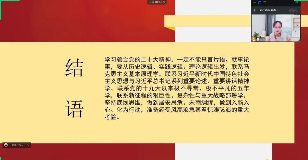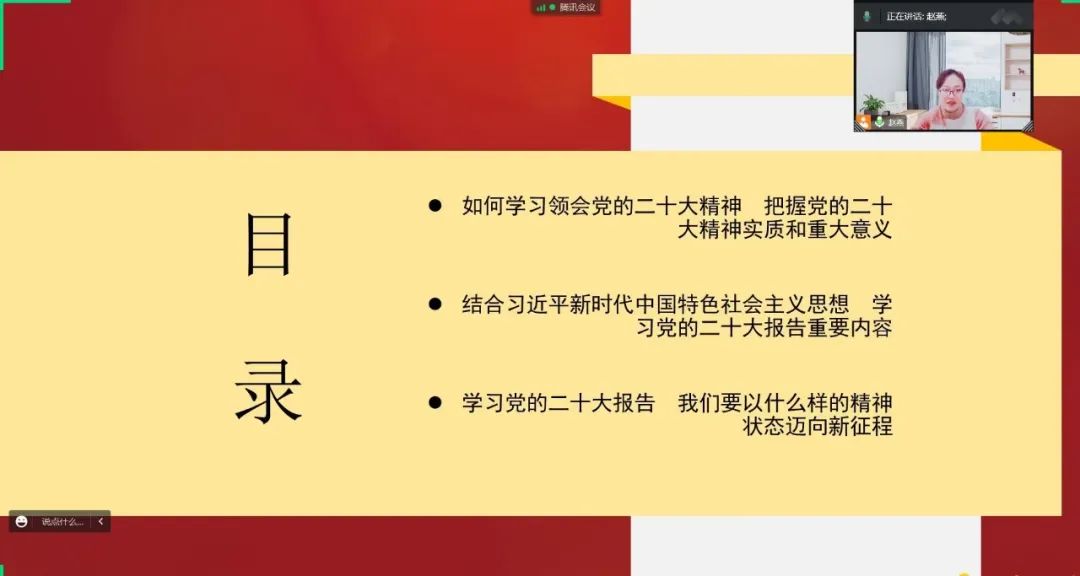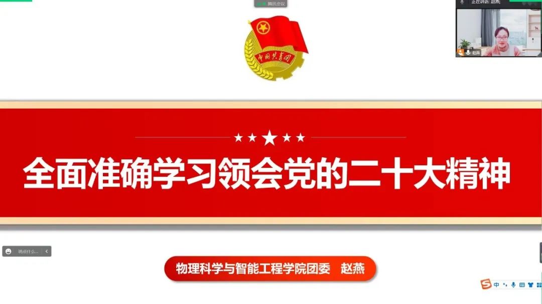 中国共产党第二十次全国代表大会,是在全党全国各族人民迈上全面建设社会主义现代化国家新征程、向第二个百年奋斗目标进军的关键时刻召开的一次十分重要的大会。为全面准确学习领会党的二十大精神,我院团委书记赵燕老师组织全体学生召开了线上会议,做了以《全面准确学习领会党的二十大精神》为题的报告。