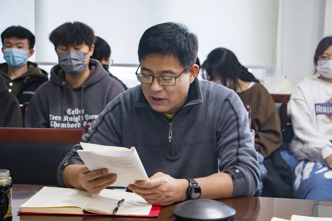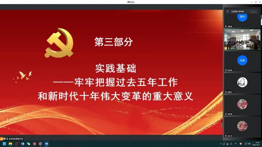学院党委书记孙文做了题为《新时代新征程坚持和发展中国特色社会主义的政治宣言和行动纲领》的二十大报告主题宣讲。孙文指出,党的二十大是在全党全国各族人民迈上全面建设社会主义现代化国家新征程、向第二个百年奋斗目标进军的关键时刻召开的一次十分重要的大会。党的二十大报告是中国共产党团结带领全国各族人民夺取新时代中国特色社会主义新胜利的政治宣言和行动纲领,是一篇马克思主义的纲领性文献,具有极强的政治性、思想性、理论性和指导性。学习宣传贯彻党的二十大精神是当前和今后一个时期重大的政治任务,要全面学习把握落实党的二十大精神,深入理解和把握党的二十大报告的主要内容。孙文在宣讲中从战略定位、大会主题、实践基础、理论指导、基本路径、政治保证、团结要求等七个方面深入解读了二十大报告的重要内容。在宣讲报告的同时,结合当前我校各项工作全面提升行动的发展实际,对学院的各项工作进行了剖析,勉励全体党员同志要抓住新时代发展机遇,抓住学校全面提升年的关键时期,为学校和学院的高质量发展做出积极贡献。