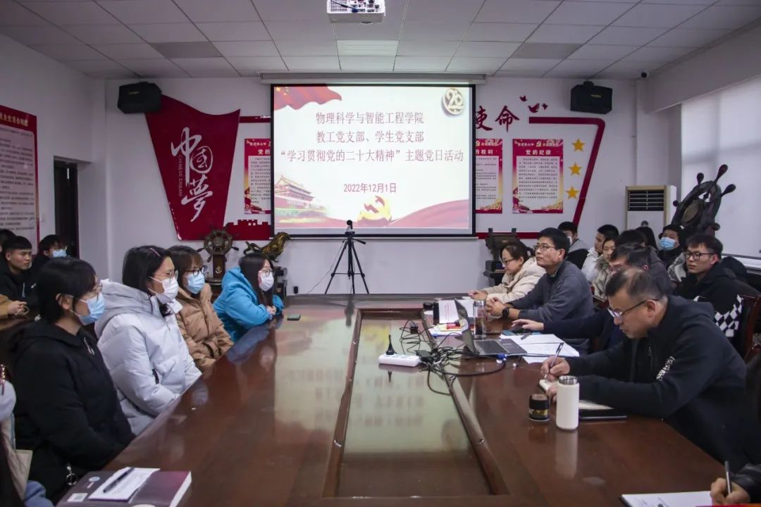 为深入学习领会党的二十大精神,进一步营造宣传贯彻党的二十大精神的浓厚氛围。2022年12月1日下午,物理科学与智能工程学院教工党支部、学生党支部采用线下和线上相结合的方式,联合开展了“学习贯彻党的二十大精神”主题党日活动,学院全体教工党员、学生党员参加了主题党日活动。