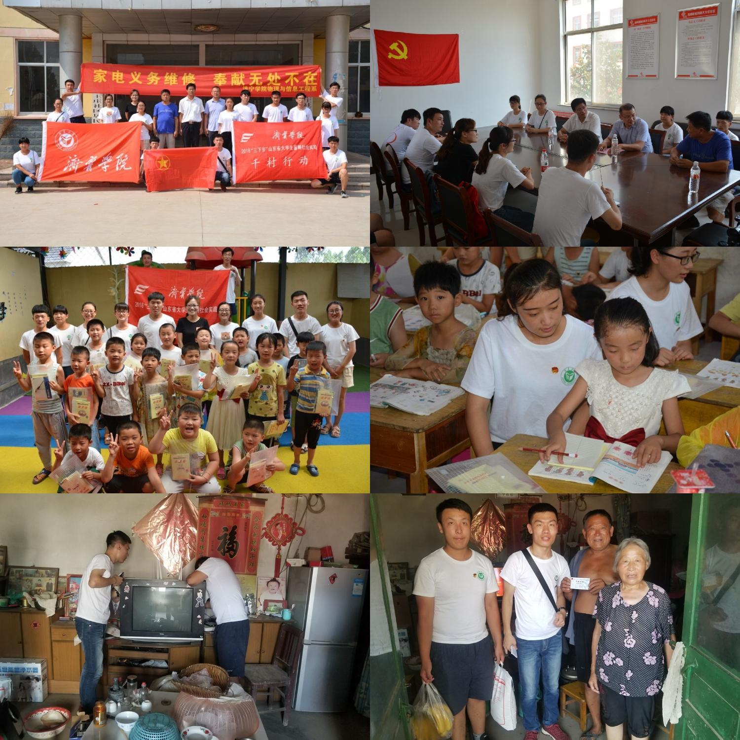 服务期间物理与信息工程系创新实验室的同学们在张营主任带领下发挥自身专业特长,通过村委会联系贫困家庭,开展了“家电义务维修、奉献无处不在”志愿服务活动,受到村民们的纷纷赞誉。师生们深入村户,关爱留守儿童,开展课业辅导、亲情陪伴,并进行文具捐赠,鼓励孩子们刻苦努力学习,长大后用实践行动回报社会。对建档立卡贫困家庭开展“送爱心赠温情”社会捐赠,进行政策宣讲及社会调研,向困难群众宣讲党和政府扶贫保障政策,调研贫困人民生产生活中存在的突出问题,并向每个建档立卡户留下“千村计划”志愿服务联系卡以确保长期联系。莒南县广播电视台对本次“三下乡.千村计划”专项活动进行了跟踪拍摄报道。