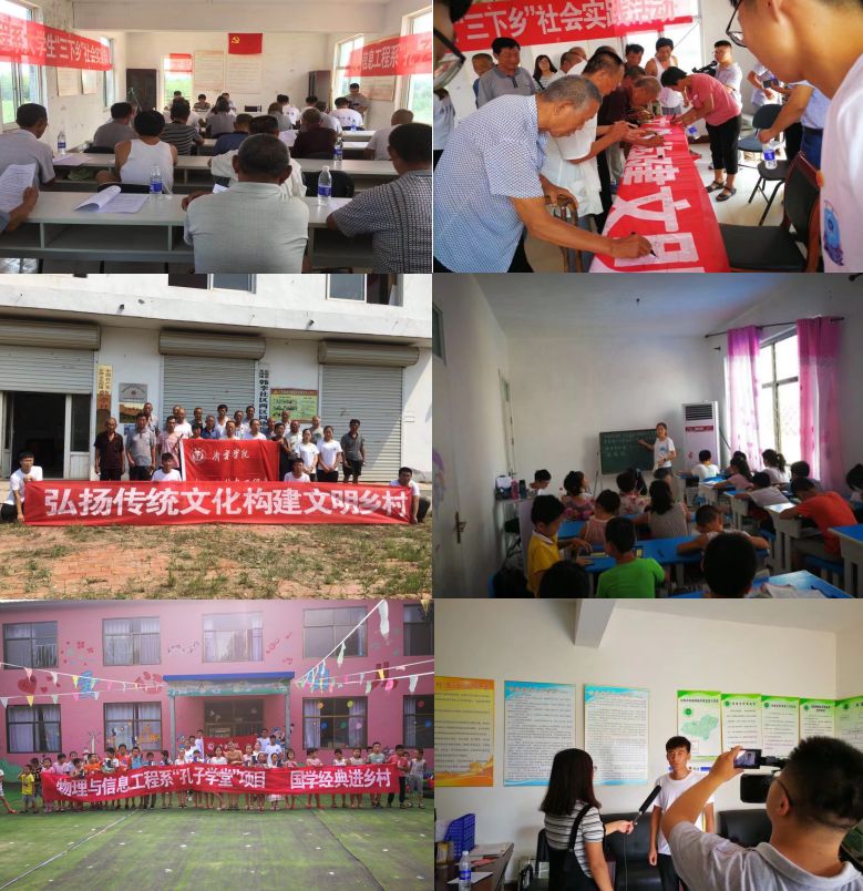 为贯彻落实党的十九大精神,“四个自信”的重要思想及两会精神。发挥学校地域特色,弘扬儒家文化办学特色,宣扬传承中华民族传统文化,推广国学经典儒家文化,根据学校《关于做好2018年大学生暑期“三下乡”社会实践活动的通知》的相关要求及物理与信息工程系“孔子学堂先锋班”成功举办的契机,物理与信息工程系学生实践队赴山东省德州市乐陵市花园镇大韩村开展“三下乡”社会实践活动暨“国学经典进乡村”活动。