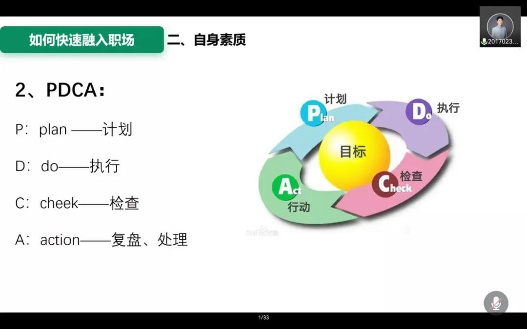 二是入职后的发展。首先是对自我的提升,进入职场后同学们应学会观察、学习和实践,观察就是要观察老员工,资质高的老员工往往有较多的经验,处事会更加圆滑,能够用更简单快速的方法完成工作,可以少走一些弯路。其次同学们要学会观察领导,提升自我的领导力,对以后晋升等都会有较大的帮助,除此以外是观察其他部门,提升自我的各项素质,拓展更多的技能,让我们有更多选择职场的机会;学习就是学习老员工以及其他领导和部门,从中学习他们的经验;实践就是将老员工的工作方法转化为自己的工作方法,将领导的决策逻辑运用到自己的工作中,以及将其他部门的技能在自己的工作中实践,更好的在职场中发展。二是自身素质的提高,可以将它概括为PDCA,P即为plan,指计划制定什么时候做某件事,怎么做这件事,d即为do,指计划的执行,C为 Check即检查工作是否根据计划执行,A为 action指复盘和处理,如果有短板和缺陷同学们要进行及时的弥补和学习。除此之外很重要的一点是同学们要学会多读书,多动脑和少说话,在工作休息时同学们应多观察周围的一切,从中学习工作经验,学会在公司中不说悄悄话,不要贬低公司的任何人,更不要越过自己的上司向老板汇报自己的工作情况。
