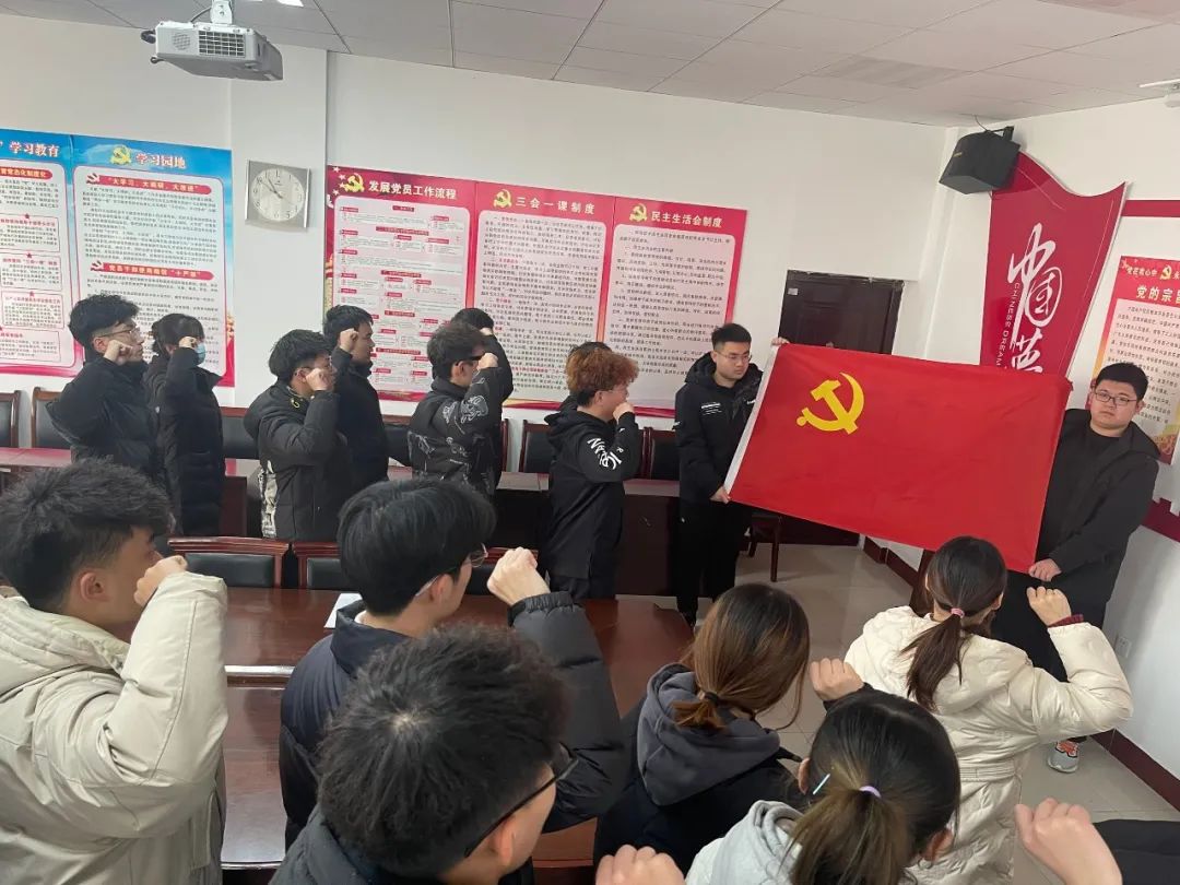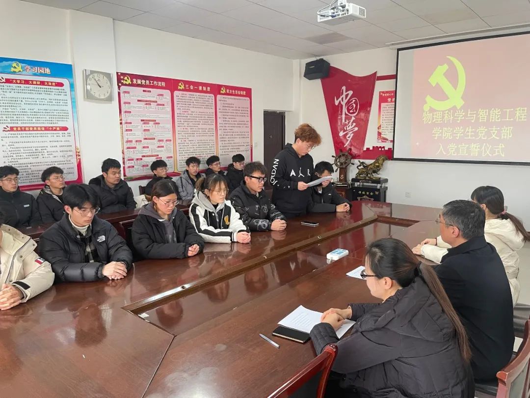 2021年12月29日,物理科学与智能工程学院2021年度新党员入党宣誓仪式分别在学院会议室与高新区大学园B2504举行。学院党委书记孙文、副书记李洪波、全体学生党员和入党积极分子代表参加仪式,宣誓仪式由学院团委书记赵燕同志主持。