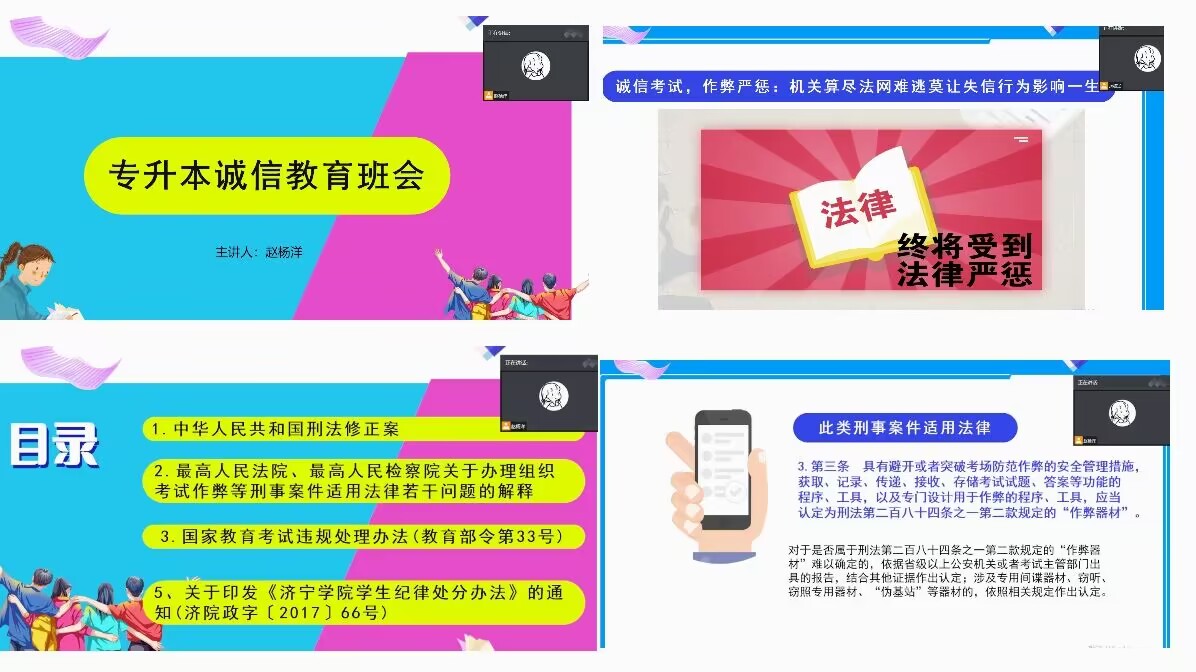 为更好的保障2023年专升本招生考试工作的开展,确保我院考生诚信应考,4月11日下午,物理科学与智能工程学院辅导员赵杨洋为电子信息工程技术专业全体专升本考生召开诚信教育主题班会。