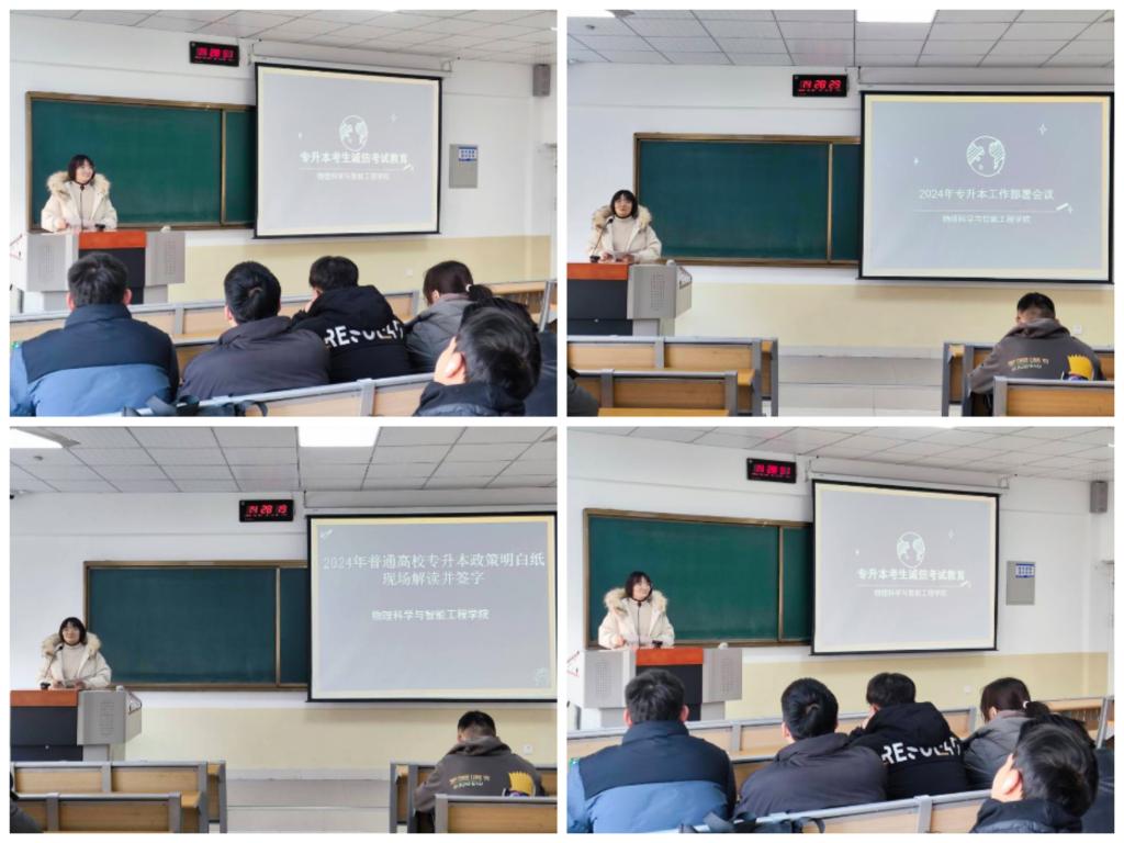 为将2024年专升本政策及时准确的传达给每一位专科生,同时激发同学们学习和报考的积极性,2023年12月20日,辅导员郝晓琳在9C306召开2024年专升本政策解读会暨考试动员会,2021级电子信息工程技术全体专科生参加。
