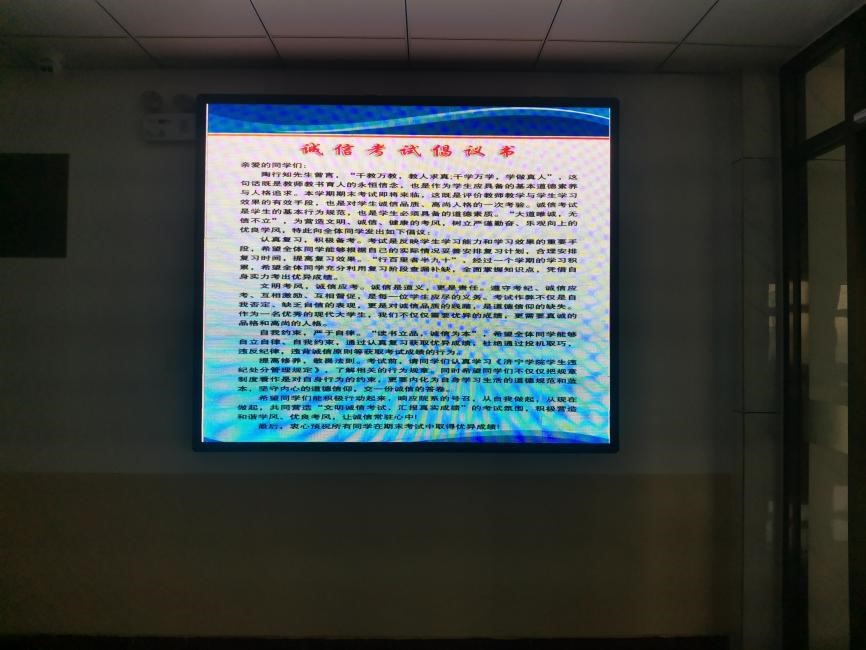 此外,学院还加大对诚信考试的宣传力度,通过学院黑板报以及学院显示屏宣传诚信考试的内容,展示诚信考试的倡议,时刻提醒着同学们注意考风考纪问题,督促同学们诚信考试。