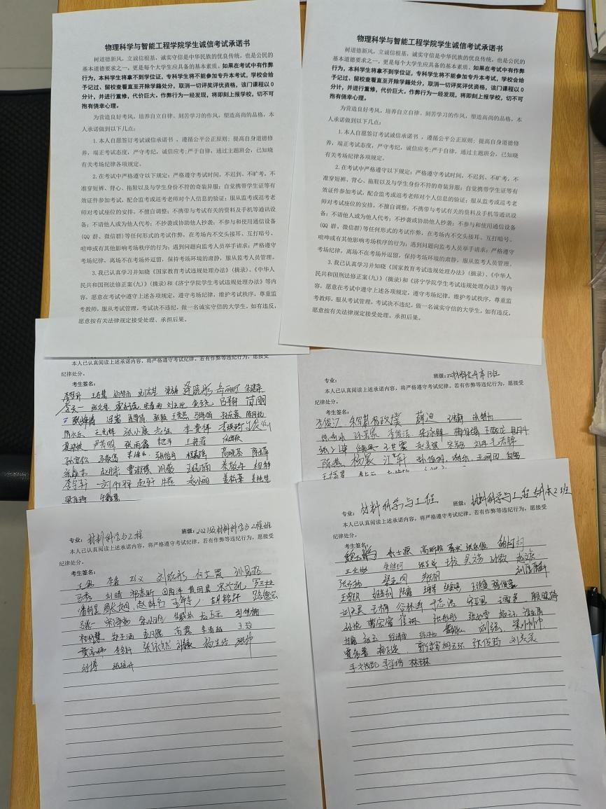 学院组织全院同学签订《物理科学与智能工程学院学生诚信考试承诺书》,告知同学们,考试纪律不只是外在强加的规范,更应该是被内化为道德标准的底线,增强学生诚信应考意识。