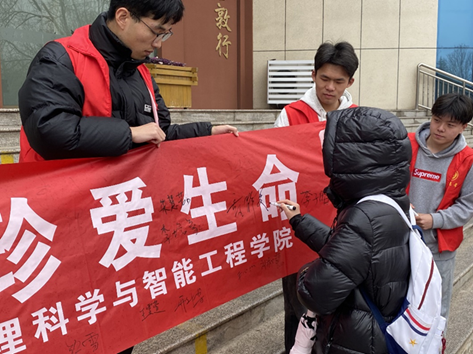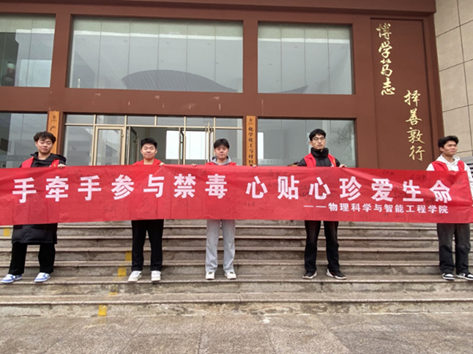 为深入学习贯彻习近平总书记关于禁毒工作重要指示精神,充分发挥学校禁毒教育主阵地作用,提高学生禁毒意识,普及禁毒知识,发扬学习雷锋为人民服务的精神,3月5日,物理科学与智能工程学院青年志愿者联合会于理科楼前开展“全民禁毒,共享幸福”为主题禁毒宣传教育活动。