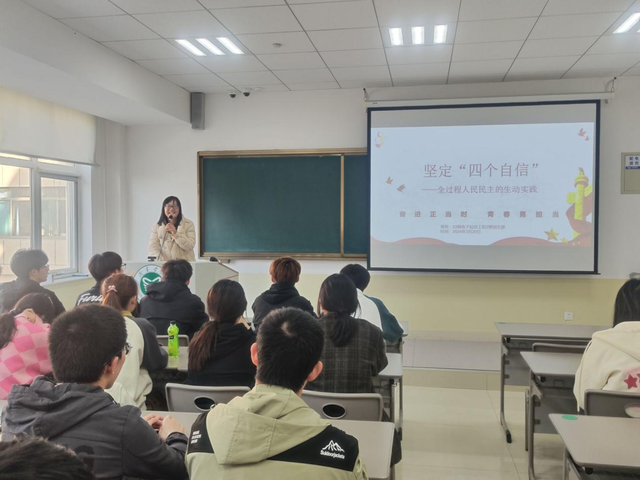 为学习贯彻全国两会精神,加强对广大团员和青年的思想政治引领,3月20日,伟德国际victor194623级电子信息工程2班团支部在9C215开展了以“坚定‘四个自信’——全国人民民主的生动实践”为主题的团日活动。学院团委书记赵杨洋应邀参加了本次活动。