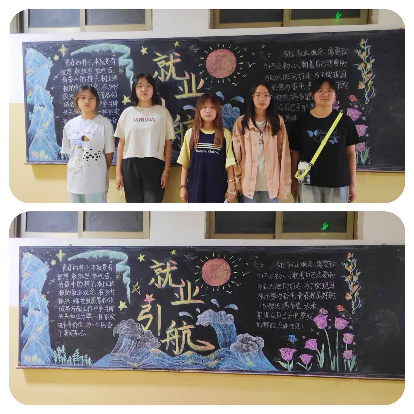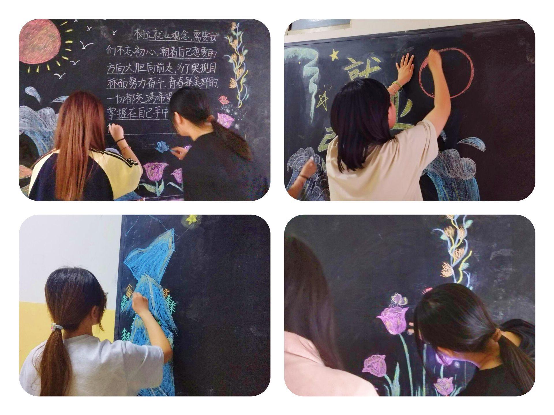 在活动过程中,学院青年志愿者们认真准备,精心设计,大家依托现有资料以及对就业形势的分析,充分发挥自己的想象力和创造力,用色彩斑斓的线条和图案,把自己对就业的理解生动形象的展现在黑板报中,其中有就业市场现状、就业市场趋势、求职技巧和面试方法等多方面的内容,帮助同学们更好地了解就业环境,彰显了同学们积极健康的择业观和就业观。