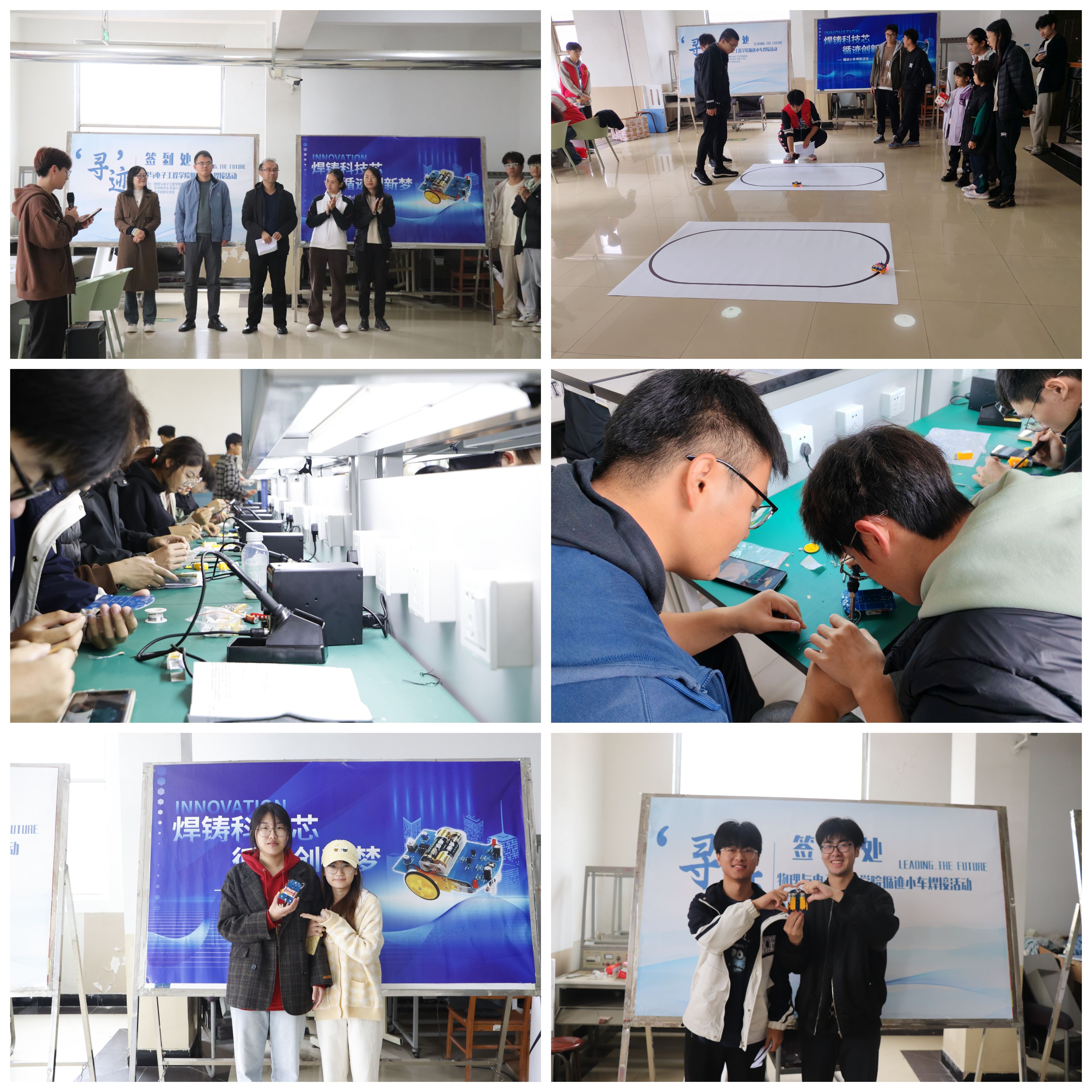 随后,活动正式开始,同学们按分组有序前往实验室,接受培训、分组焊接、调试展示。活动现场秩序井然,参赛者们分组协作,展现出了高度的热情和团队精神,电子创新实验室的同学们悉心指导,确保了操作的安全性和专业性。经过紧张而有序的操作,一辆辆循迹小车在同学们的手中逐渐成型。在比赛阶段,各队精彩展示成果,小车精准循迹,现场气氛高涨。最终,活动在欢呼声中圆满落幕。