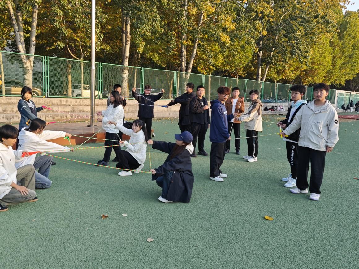 为了考验同学们的身体协调能力,加强同学之间的信任和支持,增强团队沟通和协作能力,提升团队向心力。学院心理中心开展“造房子”的游戏。游戏期间,各队分成两组,用提供的绳子围成正方形、圆形或者三角形中的一种平面造型,创建属于自己的小“房子”,拼完后与另一组的“房子”对照。