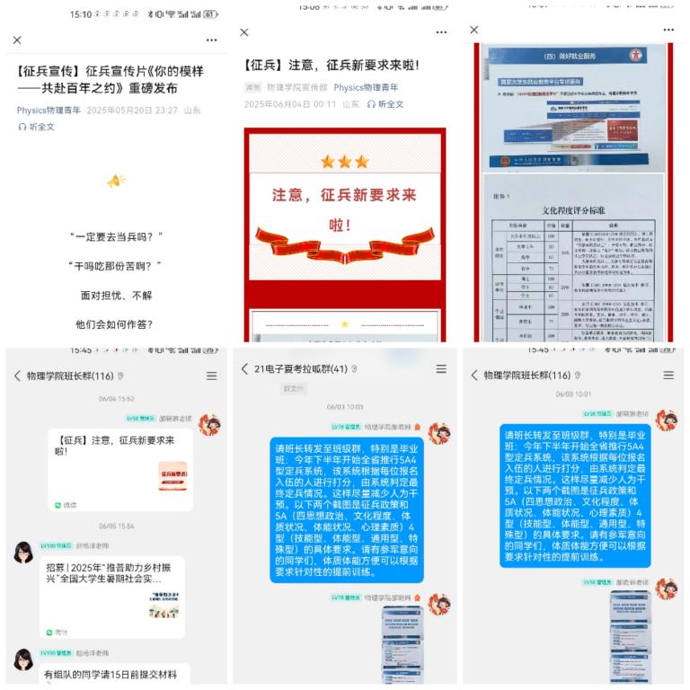 “你身体素质这么棒,要不要试试当兵去?”学院领导带着辅导员们走进宿舍,和毕业生们唠家常、谈理想,量身定制参军方案。班会、谈心时间也变成了“参军答疑专场”,辅导员们用过来人的经验,打消同学们的顾虑。目前,已有 1 名本科生在春季成功入伍,6 位同学摩拳擦掌,准备在秋季征兵中一展身手!