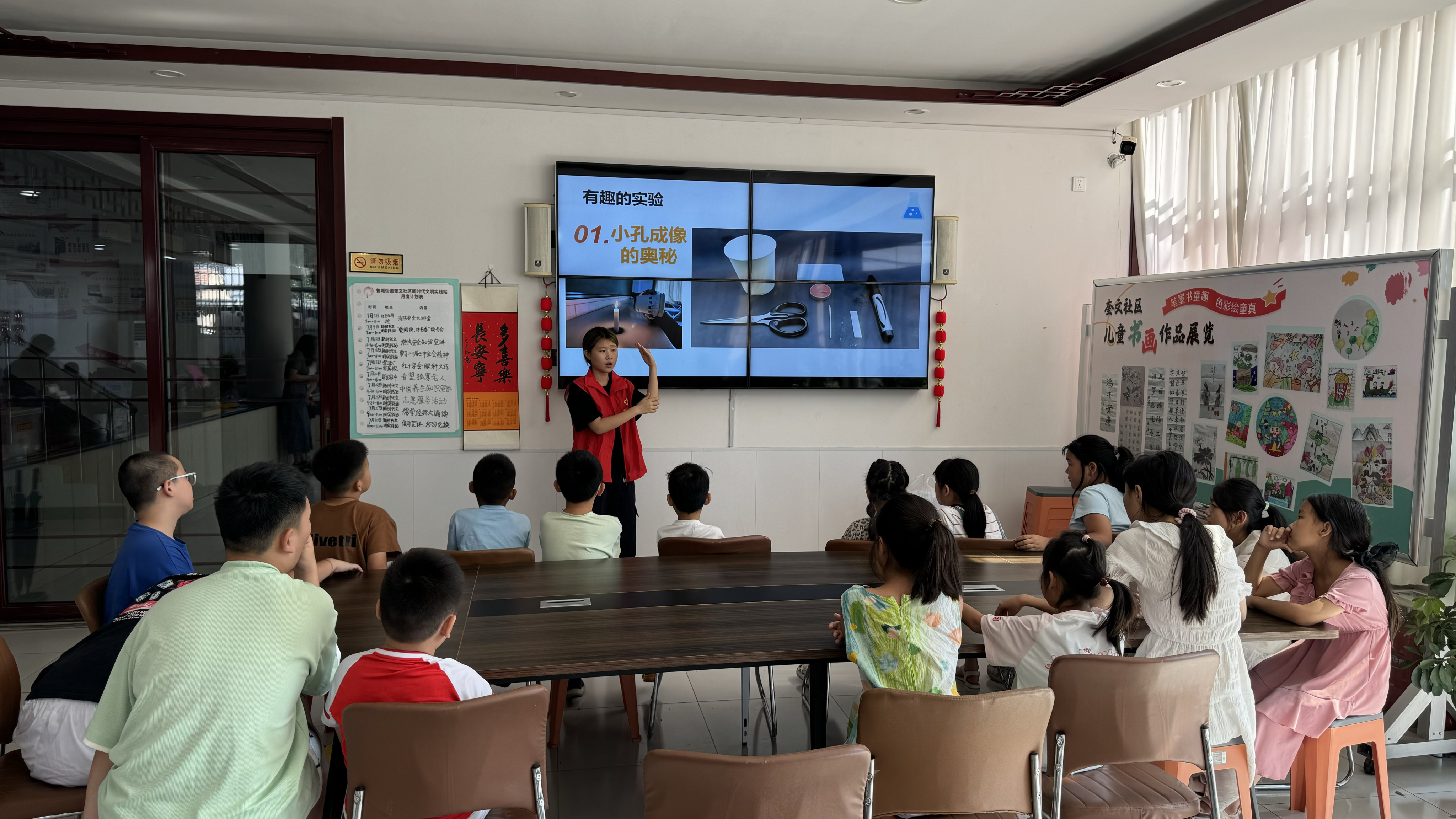 在奎文社区“光的超能力”活动中,志愿者们化身“科学向导”,引导孩子们通过小孔成像实验见证光的直线传播,在镜子成像中感受反射的奇妙,更在三棱镜分光实验中亲手“召唤”出七色彩虹;杏坛社区、南池社区“神奇的浮力”实验现场,孩子们通过物体浮沉对比、自制小船承重等实验,在水花与欢笑中揭开浮力的奥秘。在14日下午“电的奥秘”课堂上,志愿者们以生活场景为切入点——从脱毛衣时的静电现象引入,带领孩子们完成“点亮小灯泡”的实操任务,让孩子们在“动手成功”的成就感中,建立对电学的初步认知。