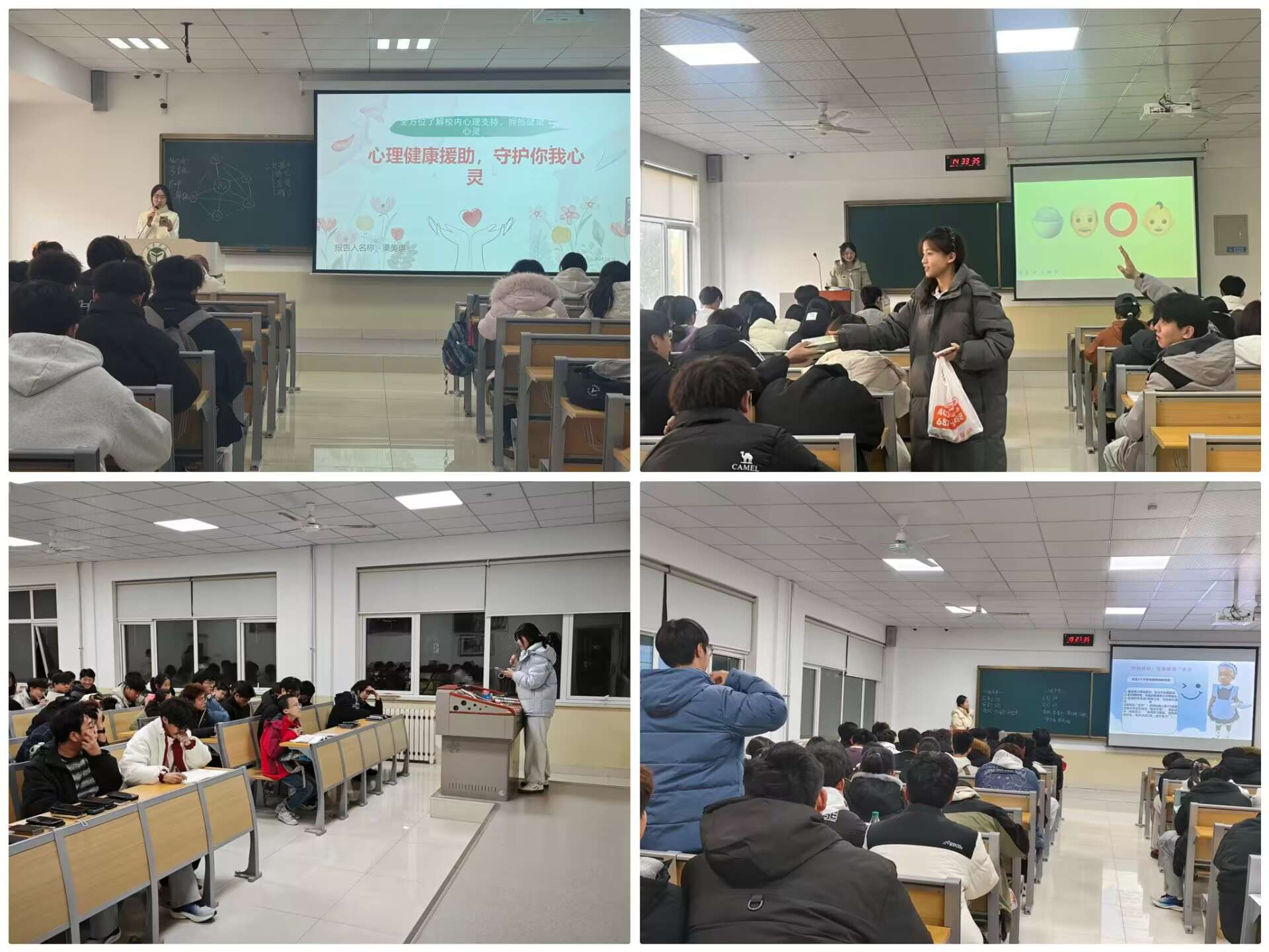 面向大一、大二学生,各班以线下班会为主要形式,通过PPT讲解、典型案例分析、科普视频播放等方式,生动介绍校内外心理咨询途径与情绪调节方法。部分班级创新开展“情绪盲盒”分享、“压力释放工作坊”等互动环节,在轻松温馨的氛围中鼓励同学们坦诚交流,共同探讨情绪管理策略,现场互动积极,氛围融洽。