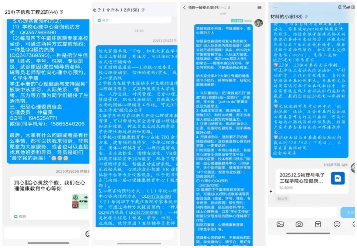 面向大三、大四学生,各班紧密结合升学考研、实习就业等现实压力,灵活采用线上专题会议、精准群内推送等形式开展。内容聚焦于学业职业压力调适,不仅提供心理援助资源信息,更整理分享了诸如时间管理工具、积极心理训练、就业心理调适等多种实用技巧,通过“资源包”形式实现心理支持的高效、精准送达。