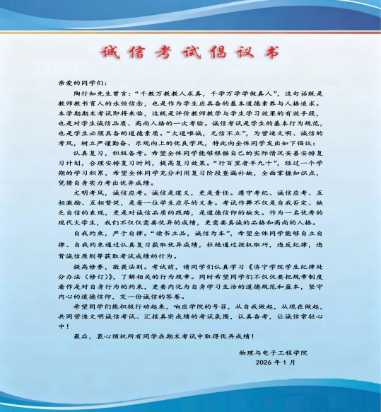 学院各班级组织召开诚信考试主题班会,辅导员与班主任带领学生学习学校相关纪律规定,结合典型案例说明考试违纪的严重后果,指导学生合理规划复习、保持积极心态。班会上,全体学生签署《诚信考试承诺书》,郑重承诺自觉遵守考试纪律。同时,学院通过微信公众号推送、电子屏滚动播放《诚信考试倡议书》,通过黑板报标语宣传诚信内涵,积极营造诚信考风。