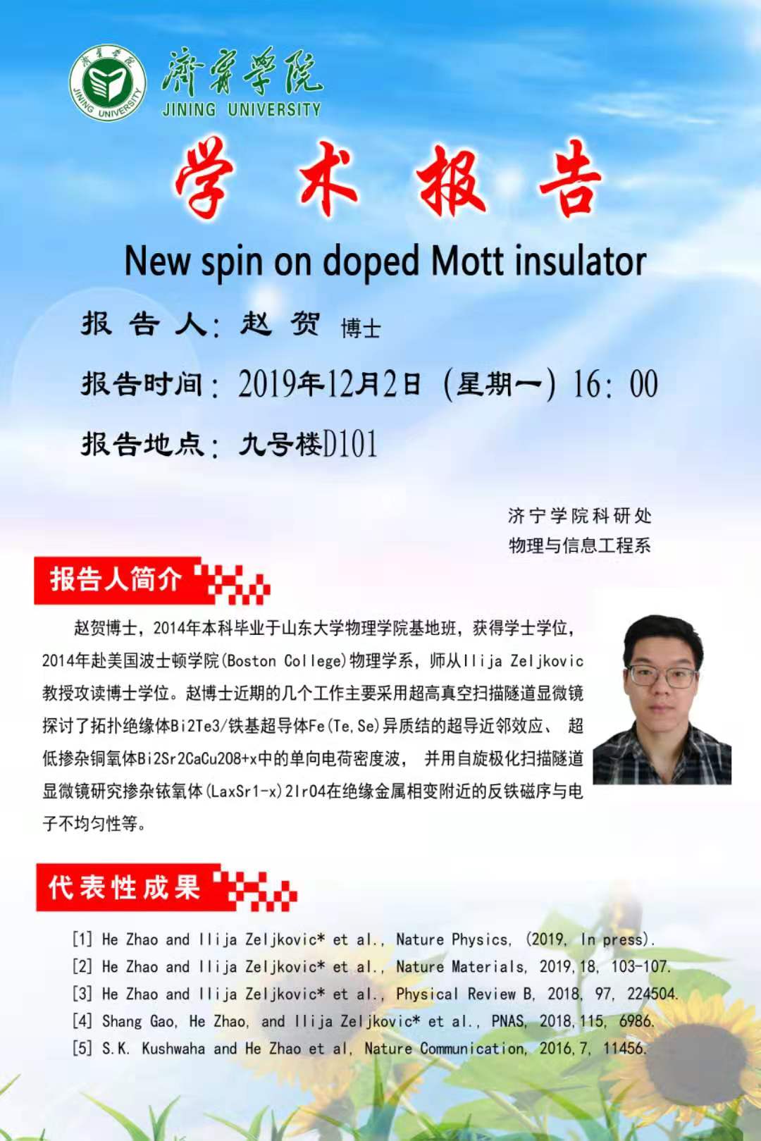 赵贺博士学术报告“New spin on doped Mott insulator”预告