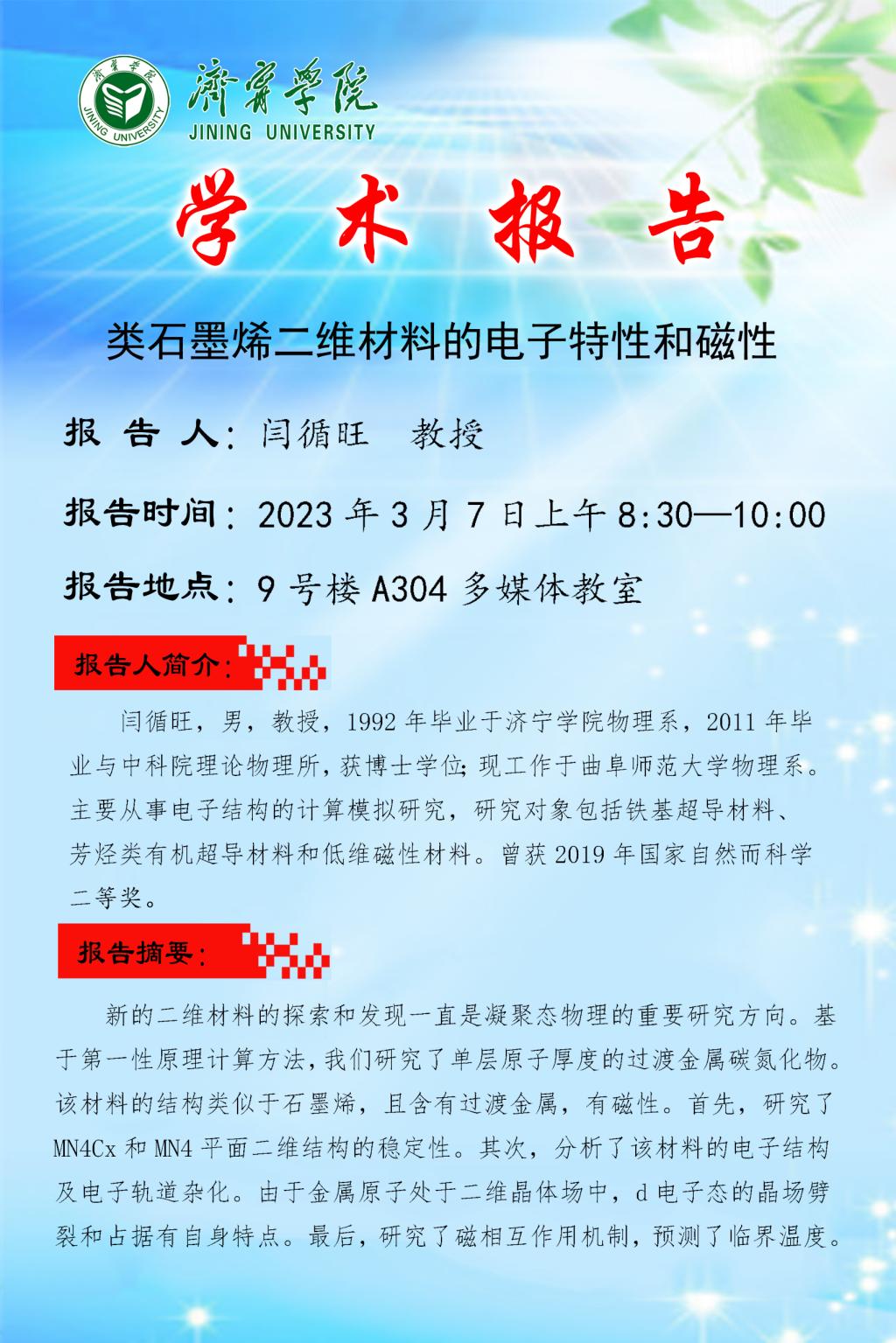 学术报告:类石墨烯二维材料的电子特性和磁性