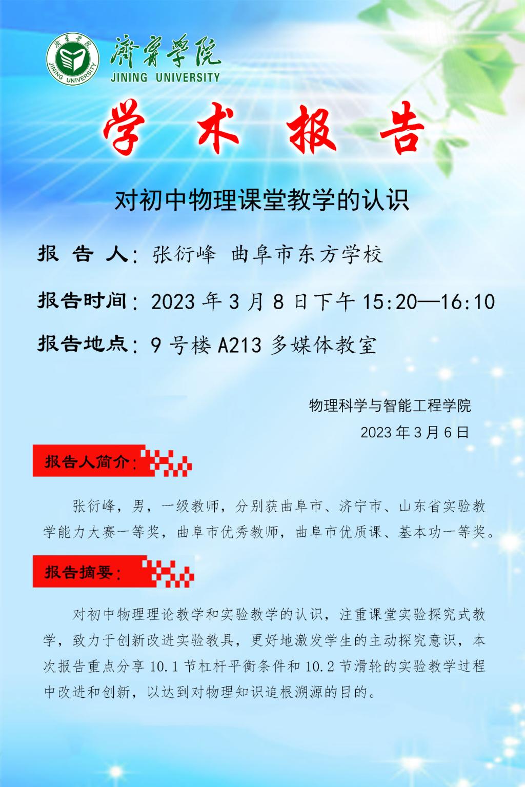 学术报告:对初中物理课堂教学的认识