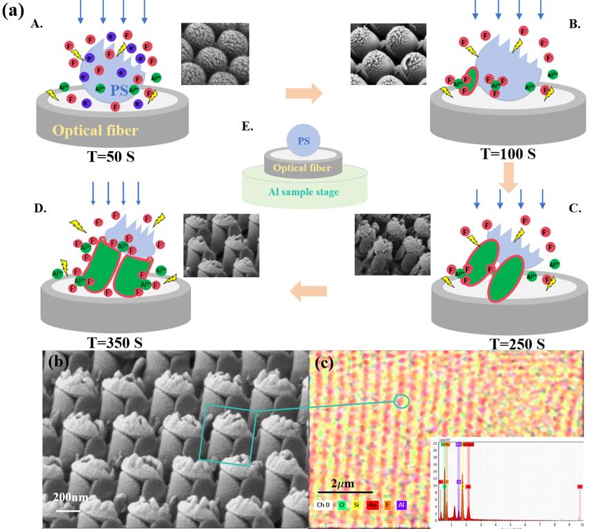 表面增强拉曼散射(Surface-enhanced RamanScattering, SERS)作为一种分子检测技术,能以较高的灵敏度获得目标分析物的“指纹信息”,已广泛应用于表面物理、生物、化学、纳米材料等领域。随着光纤传感技术的发展,基于SERS的光纤探针得到了极大关注。与传统SERS检测相比,光纤探针可以实现实时、原位和远程检测。微腔效应与SERS相结合可以有效提升拉曼探测灵敏度。本工作采用纳米球光刻和反应离子蚀刻技术,在光纤端面上制备了均匀有序的海胆帽闭合微腔阵列(SCCA)。与传统的开腔结构相比,SCCA内底部的最大电磁场强度提高了6.15倍,而腔内局部电场强度提高了9.7倍,显示出更强的光捕获能力和热点生成能力。此外,SCCA顶部的海胆状结构生成了丰富的SERS“热点”,进一步增强了局部表面等离子体共振,从而有效提升了的SERS探测性能。该研究成果对于高灵敏度的原位检测有重要意义。