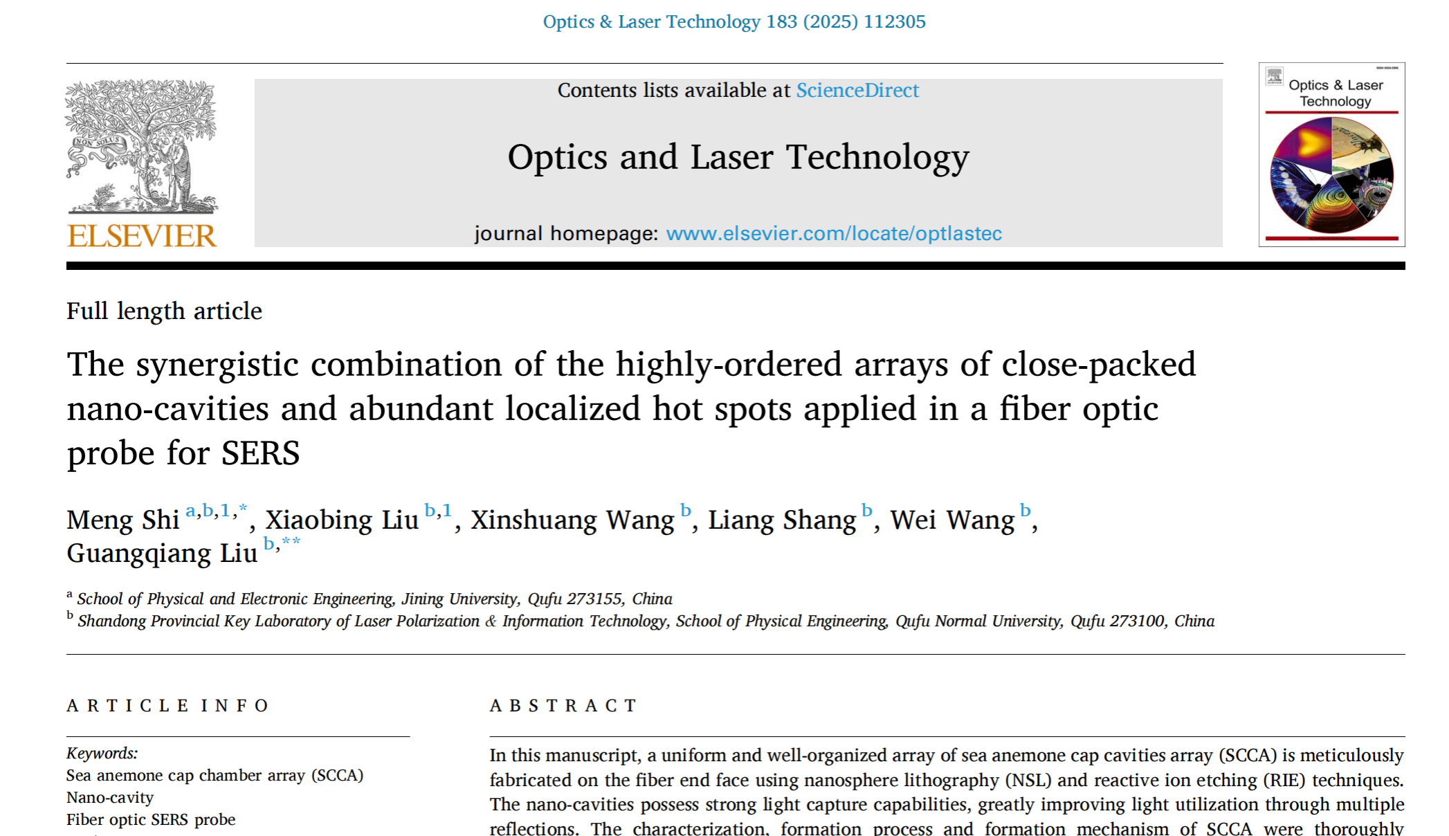 近日,我院教师史萌博士在国际知名光学期刊《Optics and Laser Technology》上发表了题为“The synergistic combination of the highly-ordered arrays of close-packednano-cavities and abundant localized hot spots applied in a fiber optic probe for SERS” 的研究成果,该期刊为中科院2区TOP期刊,IF为4.6。史萌老师为第一作者,通讯作者,史老师的硕士研究生刘小冰为共同第一作者。伟德victor1946为第一署名单位。该工作得到国家自然科学基金资助。