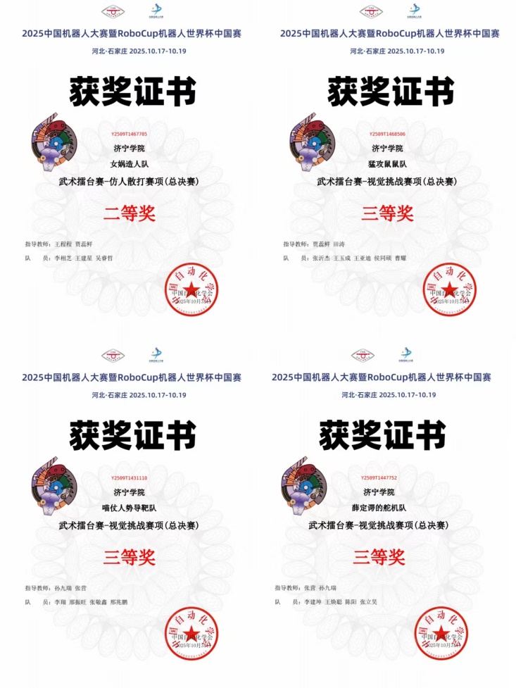 2025中国机器人大赛暨RoboCup机器人世界杯中国赛全国总决赛于10月19日在石家庄圆满落幕,近日成绩发布,我校物理与电子信息工程学院4支参赛队伍经过校赛、专项赛成功晋级全国总决赛,最终在仿人散打赛项和视觉挑战赛项中荣获全国二等奖1项、三等奖3项。